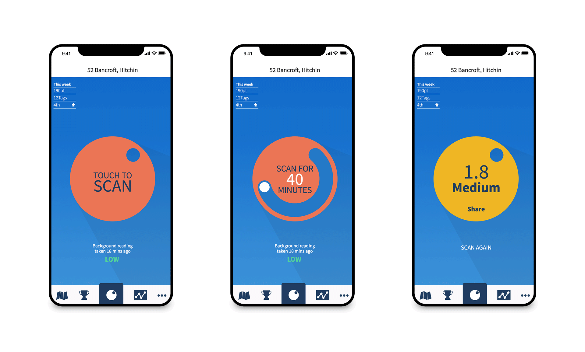 About: The world's first personal air pollution smart sensor. Working in collaboration with our partners at Curtis+Co we embarked on a two phase re-orgnisation of the app home screen. The first phase was a simple re-organisation of the home screen ui elements to emphasise core functionality, the second phase was to completley re-work the home screen focus to promote air scanning and re-fresh the visual design.