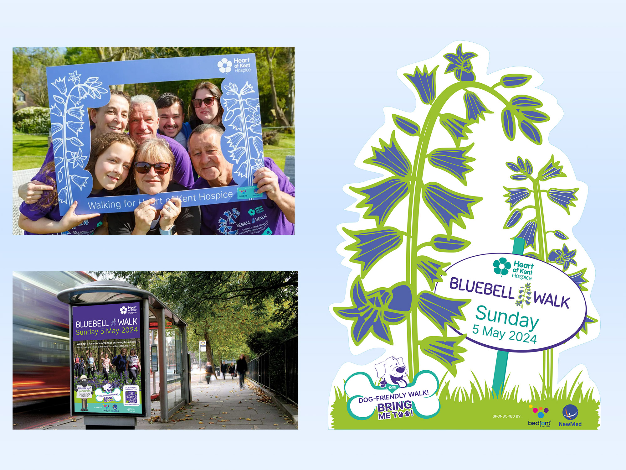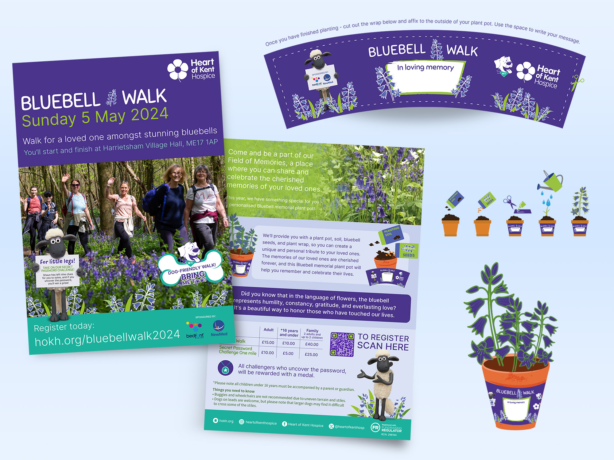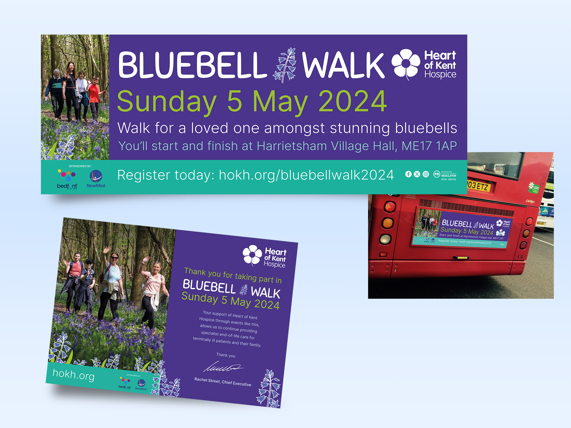 Background: Heart of Kent Hospice relies on fundraising events like the Bluebell Walk to enable to continue to give excellent care to those in the local community. Heightening exposure and creating clear visual communication encourages maximum attendance and in turn funds raised for the charity.